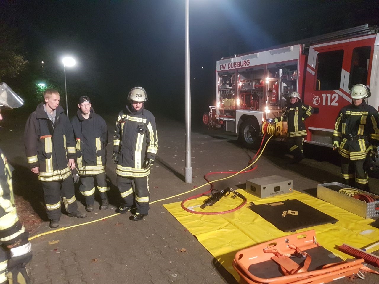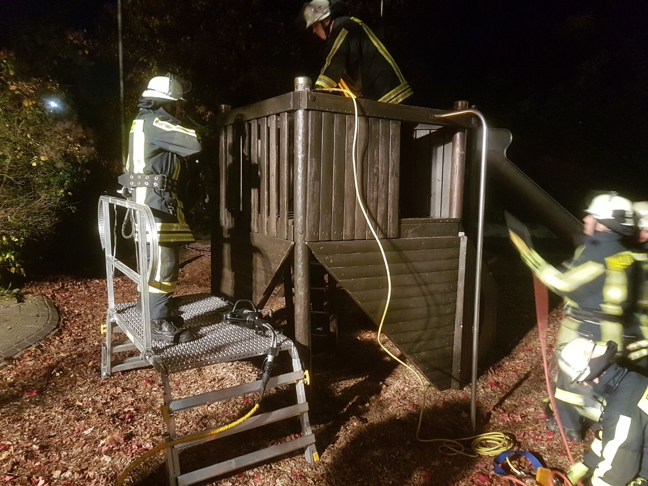 Gleich zwei Übungsszenarien gab es am Donnerstag beim wöchentlichen Dienstabend. So bekamen die Anwärter des Löschzuges einen kleinen Eindruck in das breite Aufgabengebiet, das die Feuerwehr heutzutage abdeckt. Bei der ersten Übung war die angenommene Lage, dass ein Kind beim Spielen unglücklich in einem Klettergerüst eingeklemmt wurde. Neben der Erstversorgung und Betreuung des Kindes lag der Fokus auf der technischen Rettung. Hierbei setzten die Einsatzkräfte unter anderem einen Rettungsspreizer und Hebekissen ein, sodass eine Öffnung geschaffen und das Kind befreit werden konnte.