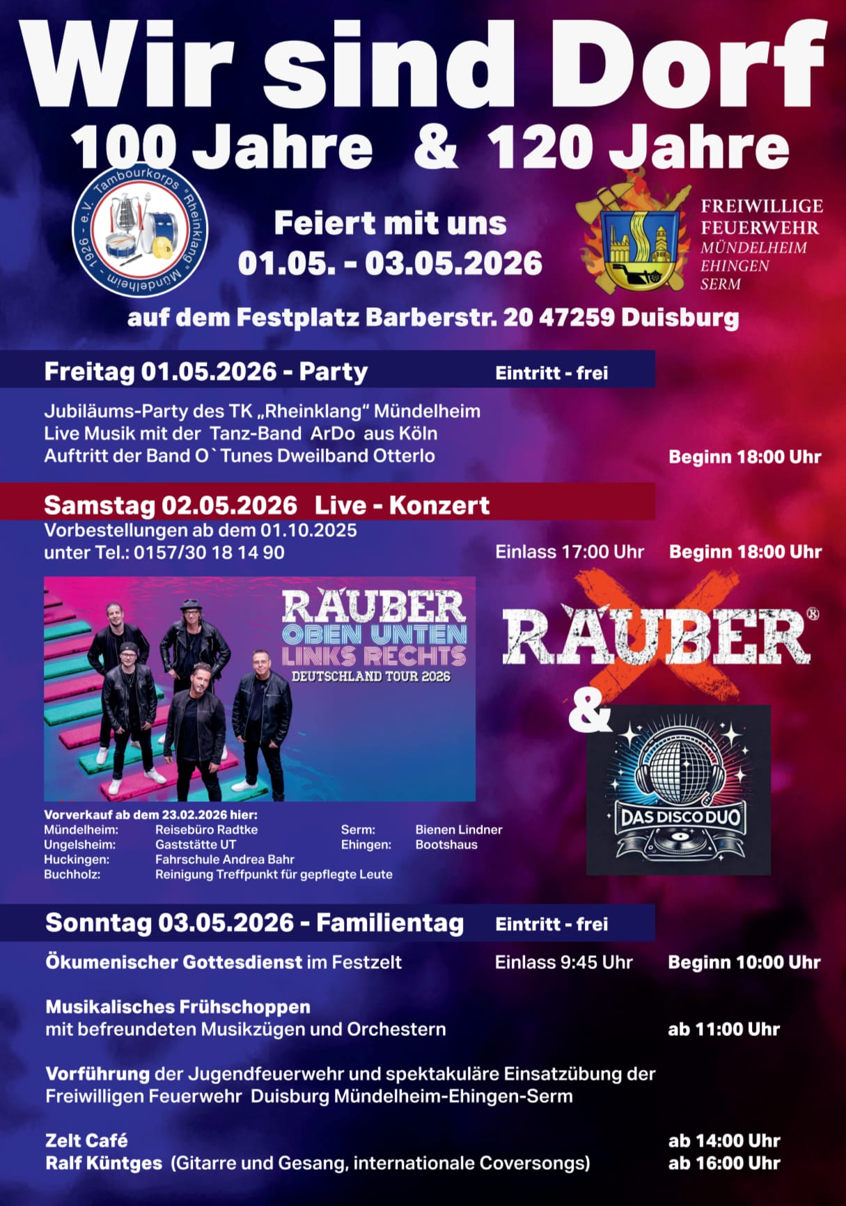 – Live-Konzert der Kölner Kultband „Räuber“ im Rahmen ihrer Deutschland-Tournee, der Vorverkauf beginnt am 23.02.2026, ebenfalls sind telefonische Vorbestellungen möglich!