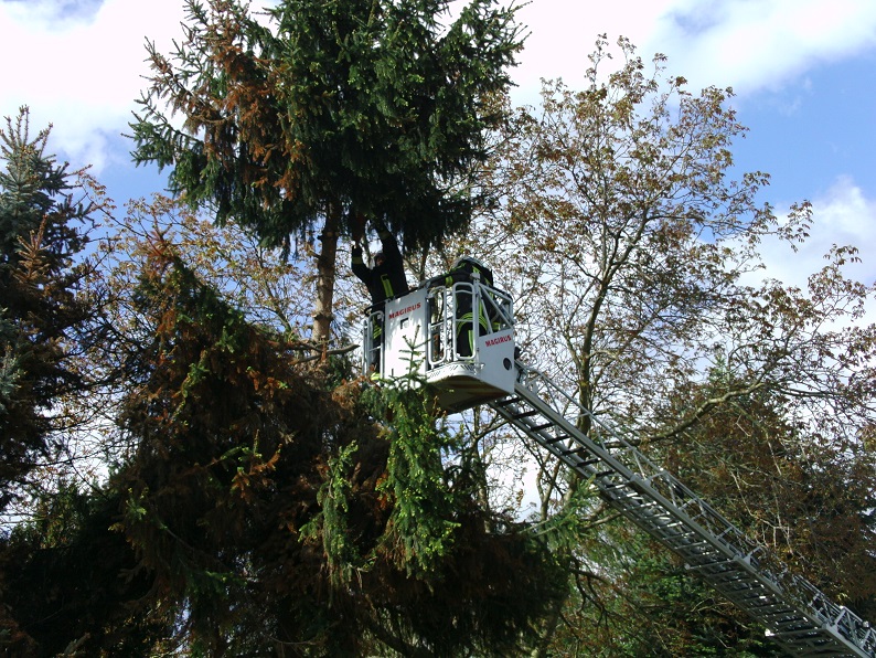 Infolge des Sturmtiefs „Zoran“ drohte an der Kegelstraße eine Tanne umzustürzen. Über eine Drehleiter wurde der Baum stückweise gefällt. Anschließend wurden die Äste sowie der Stamm mit einer Kettensäge zerkleinert und von der Fahrbahn geräumt.