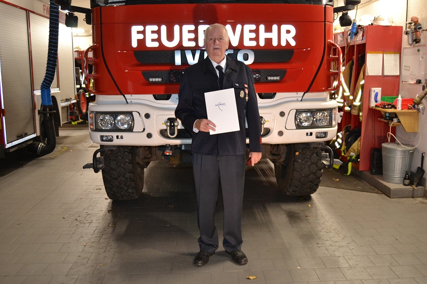 Zum Abschluss erfolgte eine besondere Ehrung: nachdem unser Kamerad Günther Maurmann bereits im vergangenen Jahr für 50 Jahre Mitgliedschaft in der Feuerwehr durch den Stadtfeuerwehrverband Duisburg geehrt wurde, hat unser Günni nun das Feuerwehr-Ehrenzeichen des Landes Nordrhein-Westfalen in Gold mit Goldkranz verliehen bekommen.