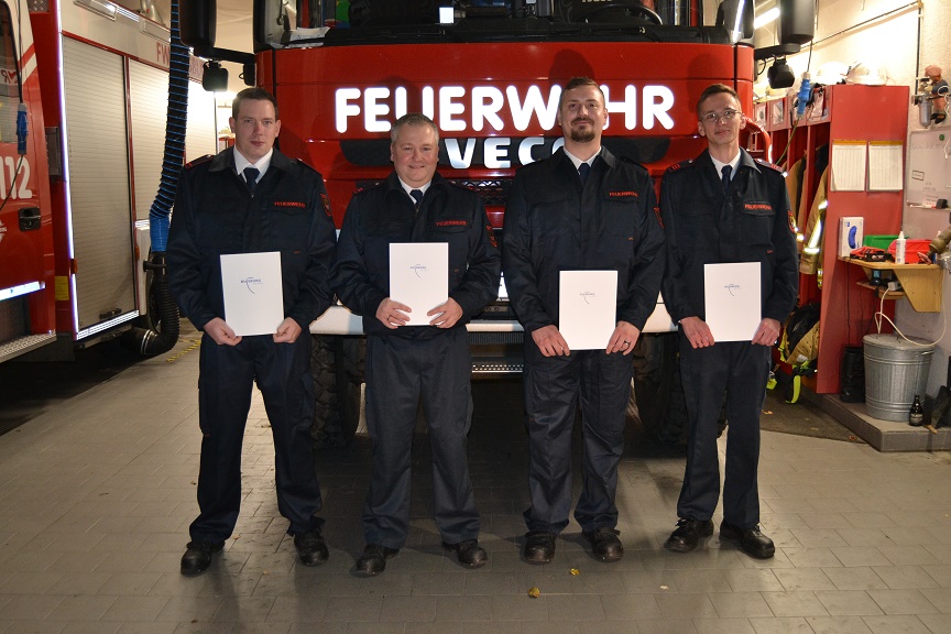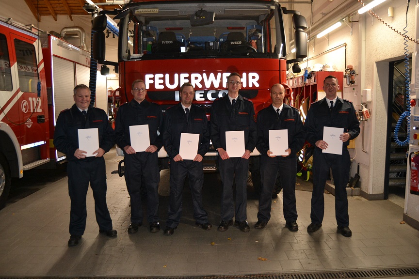 Darüber hinaus haben gleich sechs Funktionsträger ihre Ernennungsurkunden erhalten. Die bekleiden nun auch offiziell die Funktionen der Gerätewarte, der Atemschutzgerätewarte und der Vertrauensperson.