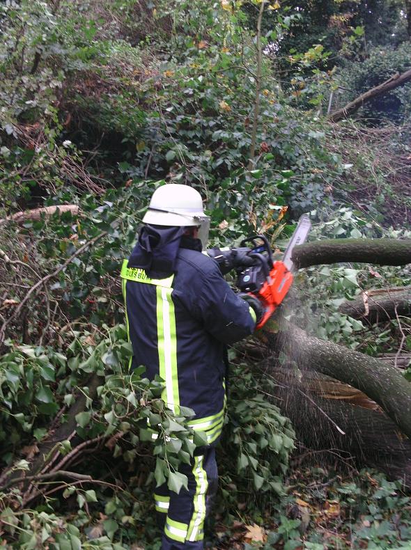 Heftige Windböen sorgten dafür, dass auf der Mannesmannstraße ein Baum umstürzte und die Fahrbahn blockierte. Dieser wurde mit zwei Kettensägen zerkleinert und anschließend beiseite geräumt.