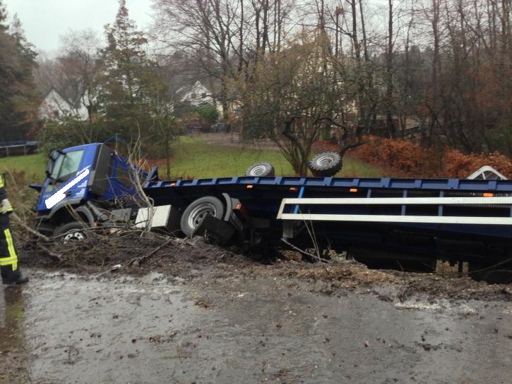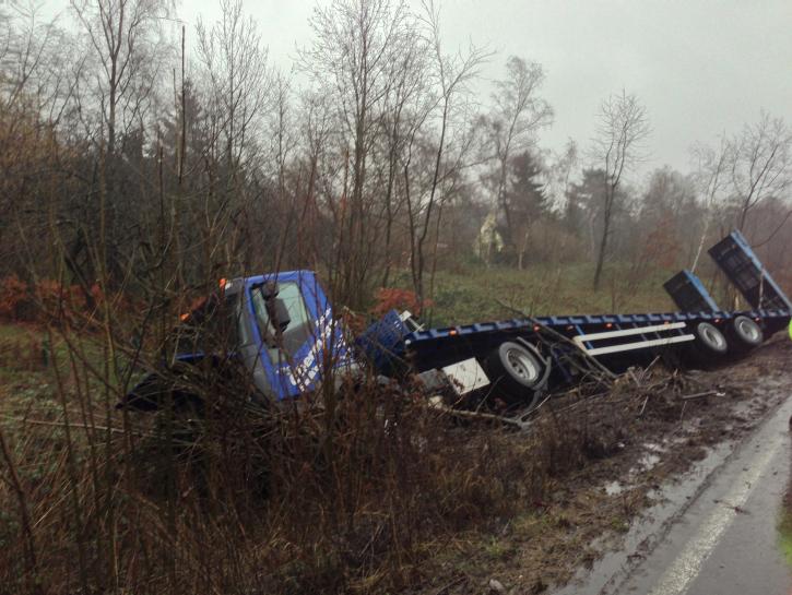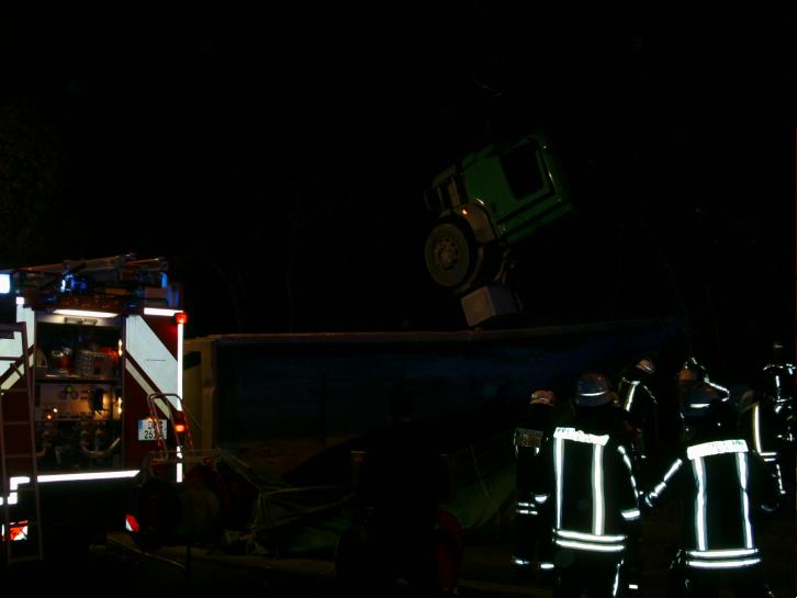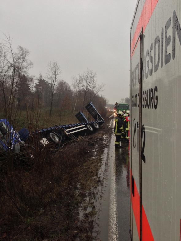Ein mit einer Hebebühne beladener Sattelzug kam auf der Bundesstraße 288 in Fahrtrichtung Krefeld kurz hinter der Anschlussstelle Duisburg-Huckingen von der Fahrbahn ab und kippte den Seitenstreifen hinab. Der Fahrer, der bei dem Unfall leicht verletzt wurde, war nicht eingeklemmt und konnte sich selbstständig aus dem Führerhaus befreien. Allerdings liefen Betriebsmittel aus, die von der Feuerwehr gebunden werden mussten.