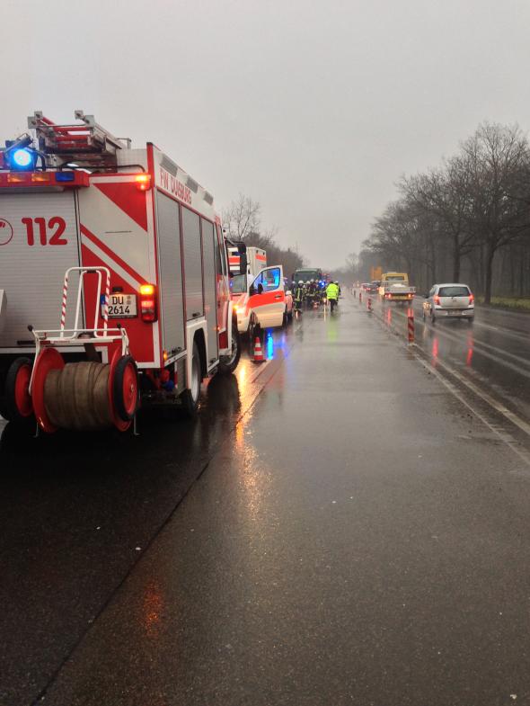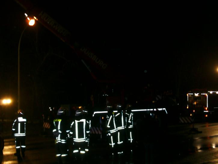 Auf der Uerdinger Straße ereignete sich in Höhe der Bushaltestelle Ehinger Berg ein schwerer Verkehrsunfall. Ein mit Schlacke beladener Sattelzug geriet in die Bushaltestelle und blieb auf der Seite liegen. In Folge des Unfalls wurden vier Personen schwer, der LKW-Fahrer und ein Ersthelfer leicht verletzt. Unter der Beladung des Sattelzuges, die sich auf dem Gehweg verteilte, wurde zunächst noch eine Person vermutet. Glücklicherweise bestätigte sich die Vermutung nach erfolgter Suche nicht. Im Anschluss an die Bergung des LKWs wurden auslaufende Betriebsmittel abgestreut.