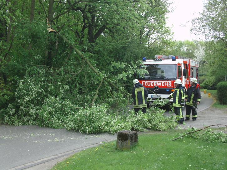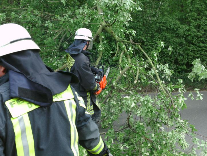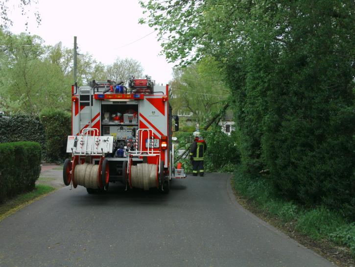 Eine abgeknickte Baumkrone blockierte die Einmündung der Straße Im Haselbusch in die Uerdinger Straße. Die Baumkrone wurde mit einer Kettensäge zerlegt und anschließend beiseite geräumt.