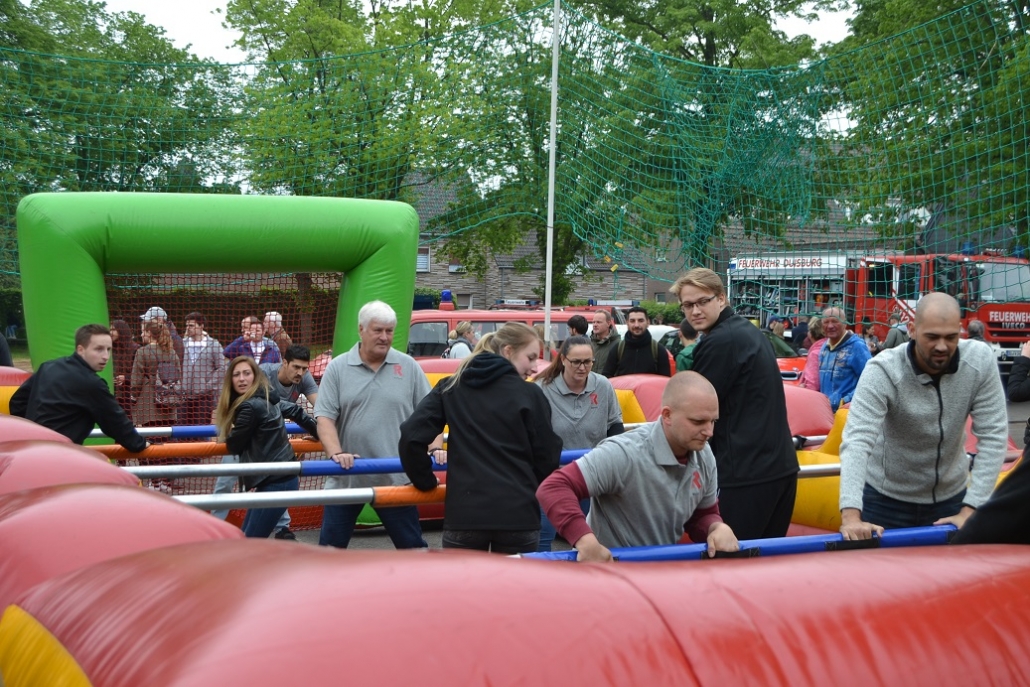 Die Mannschaft des Löschzuges 750 erwischte einen Blitzstart in die Partie und legte sprichwörtlich wie die Feuerwehr los: Das 19-Uhr-Läuten der St. Dionysius-Kirche war noch zu hören, als sich das Nesthäkchen René erstmals im Sechszehner durchsetzte und die frühe Führung erzielen konnte. Nur wenige Zeigerumdrehungen war Amtsleiter Oliver Tittmann völlig frei im Strafraum und erhöhte auf 2:0. Nach den frühen Toren zog sich die Mannschaft des Löschzuges 750 zurück und lauerte fortan auf Konter. Währenddessen wurden die TuS-Damen immer stärker und nutzten einen Patzer von Torhüter Guido Putscher zum Anschlusstreffer. Weitere Treffer fielen in der ersten Hälfte nicht, sodass das Team der Feuerwehr mit einer knappen 2:1-Führung in die Pause ging.