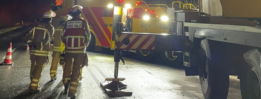 In der Nacht zum Mittwoch wurde der Löschzug 750 gemeinsam mit der Unteren Wasserbehörde erneut zur Unfallstelle des Vorabends alarmiert. Grund für die Alarmierung war Kraftstoff, der aus den beschädigten Tanks des LKW ausgetreten ist. Die Kräfte des Löschzuges 750 übernahmen zunächst die Verkehrsabsicherung und standen in Bereitschaft. In Absprache mit der Unteren Wasserbehörde war ein Eingreifen jedoch nicht notwendig. Nach etwas mehr als eineinhalb Stunden rückten die Kräfte des Löschzuges 750 wieder ein.