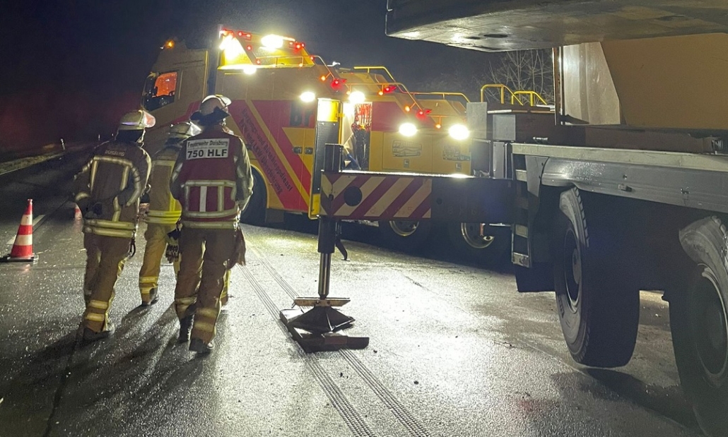 In der Nacht zum Mittwoch wurde der Löschzug 750 gemeinsam mit der Unteren Wasserbehörde erneut zur Unfallstelle des Vorabends alarmiert. Grund für die Alarmierung war Kraftstoff, der aus den beschädigten Tanks des LKW ausgetreten ist. Die Kräfte des Löschzuges 750 übernahmen zunächst die Verkehrsabsicherung und standen in Bereitschaft. In Absprache mit der Unteren Wasserbehörde war ein Eingreifen jedoch nicht notwendig. Nach etwas mehr als eineinhalb Stunden rückten die Kräfte des Löschzuges 750 wieder ein.