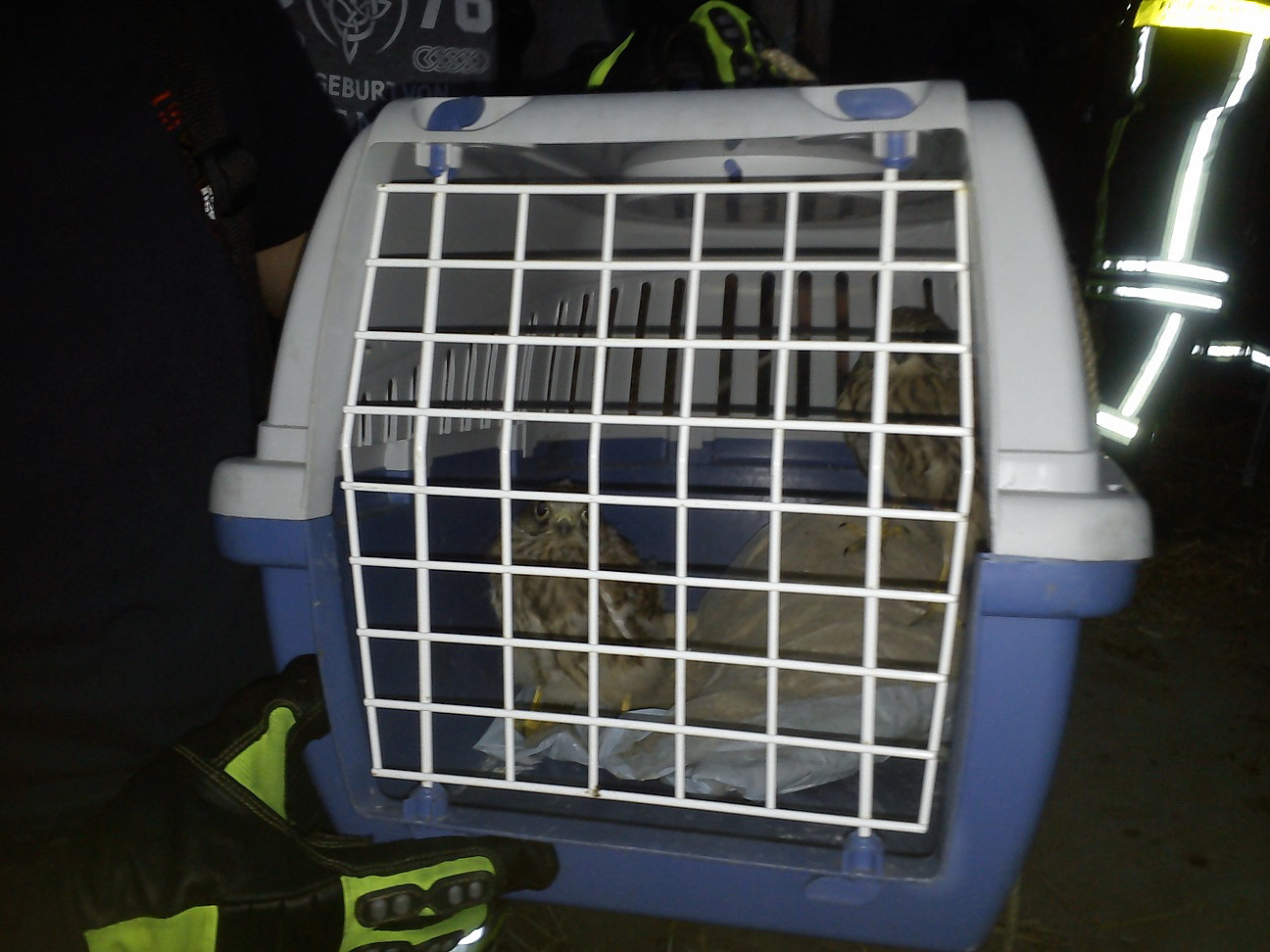 Über die dreiteilige Schiebeleiter konnte ein Zugang zum Vogelkasten hergestellt werden. Leider kam für ein Küken jede Hilfe zu spät, zwei weitere Jungtiere konnten allerdings aus dem Nistkasten gerettet werden. Ein vierter Falke flog zunächst davon und versuchte dann zu Fuß aus der Scheune zu flüchten. Angesichts der Überlegenheit der drei ihn verfolgenden Feuerwehrleute ergab sich der junge Vogel jedoch freiwillig und konnte in die Obhut eines Vogelschützers übergeben werden. Dieser wird die drei überlebenden Jungtiere nun in seiner Aufzuchtstation aufpeppeln.