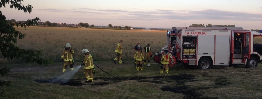 Am Mittwochabend wurde der Feuerwehr Duisburg gegen 21 Uhr eine unklare Rauchentwicklung Nahe der Mündelheimer Rheinbrücke gemeldet. Bereits auf der Anfahrt konnte südlich der Bundesstraße 288 ein Feuerschein auf dem Rheindeich bemerkt werden. Vor Ort wurde festgestellt, dass auf einer Fläche von rund 10 bis 15 Quadratmetern frisch gemähtes Heu brannte. Das Feuer wurde zunächst mit dem Schnellangriff des Hilfeleistungslöschgruppenfahrzeuges eingedämmt, anschließend wurden einzelne Glutnester ausgemacht. Da im näheren Umfeld weitere Glutnester nicht ausgeschlossen werden konnten, wurde die Wiese sicherheitshalber bewässert. Nach rund 20 Minuten konnten die 18 Einsatzkräfte des Löschzuges 750 wieder an ihren Standort einrücken.