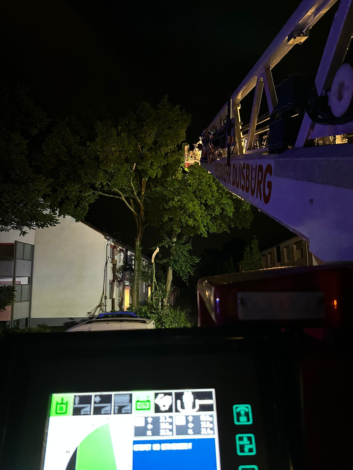 Anschließend wurden zwei Einsatzstellen in Ungelsheim abgearbeitet. Erst wurde ein loser Ast in einem Baum gemeldet. Allerdings war hier größtenteils die Baumkrone herausgebrochen. Diese wurde über die Drehleiter entfernt und im Anschluss mit einer Kettensäge zerlegt. Anschließend mussten aus einem weiteren Baum lose Äste geschnitten werden, damit weitere Kräfte der Feuerwehr Duisburg sicher an ihrer Einsatzstelle arbeiten konnten.