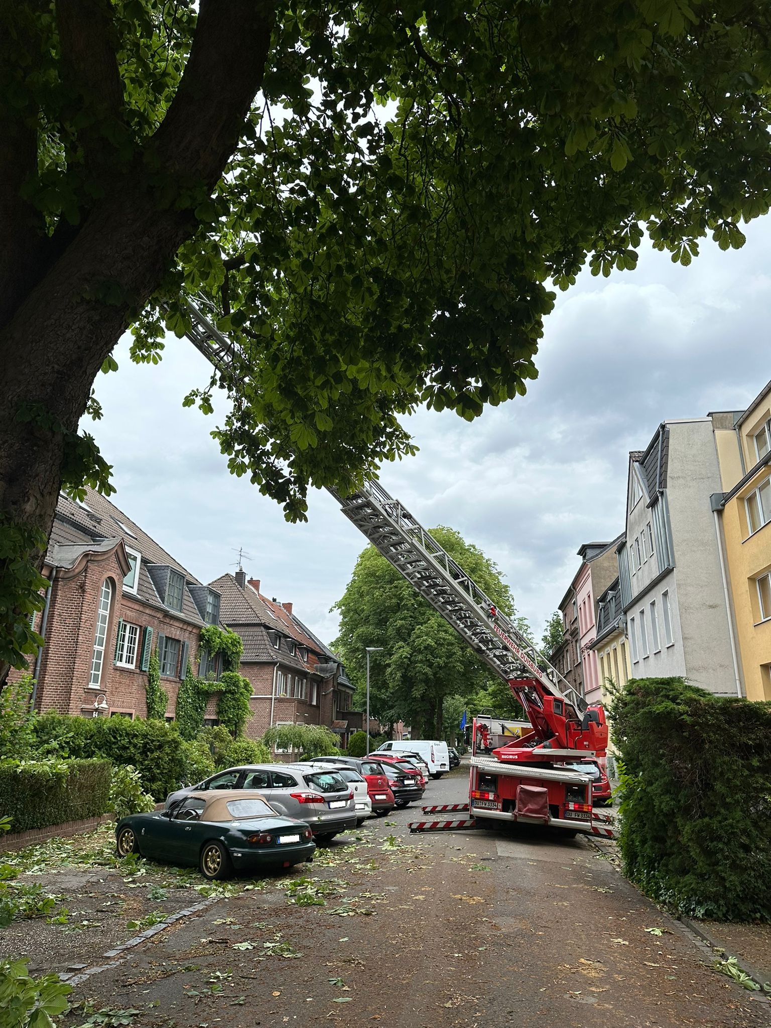Zunächst rückte die Einheit zu einem gemeldeten umgestürzten Baum nach Huckingen aus. Vor Ort wurde ein großer Ast vorgefunden, der aus einer Krone herausgebrochen war und eine Fahrspur sowie den Fuß- und Radweg blockierte. Dieser wurde mittels Kettensäge zerlegt und beiseite geräumt. Weitere Äste, die auf den Gehweg zu stürzen drohten, wurden über die Drehleiter entfernt. Zwischenzeitlich wurden zwischen Mündelheim und Serm hochgedrückte Gullydeckel, die eine Gefahr für Verkehrsteilnehmer darstellten, wieder positioniert.