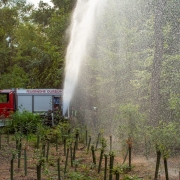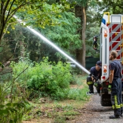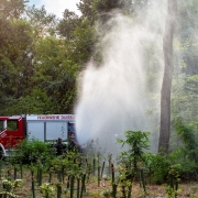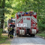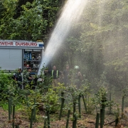 Am Donnerstagabend wurde der Löschzug 750 gemeinsam mit einem Sonderfahrzeug der Berufsfeuerwehr im Rahmen der Amtshilfe zur Unterstützung des Umweltamtes der Stadt Duisburg gerufen. Dieses hat erst kürzlich umfangreiche Neupflanzungen im Ehinger Wald durchgeführt, die nun besonders unter der aktuellen Trockenperiode leiden. Die Aufgabe der Feuerwehr war es, die jungen Bäume sowie Sträucher und Sätzlinge großflächig zu bewässern. Kleinere Flächen wurden hierbei mit den Schnellangriffseinrichtungen der beiden Löschgruppenfahrzeuge bewässert. Bei größeren Flächen kam darüber hinaus ein Wasserwerfer zum Einsatz, der aus einem 10.000 Liter Wasser fassenden Abrollbehälter gespeist wurde. Die Wasserversorgung wurde dabei über mehrere hundert Meter lange Schlauchleitung sichergestellt. Nach rund drei Stunden konnte die Feuerwehr ihren Einsatz beenden.