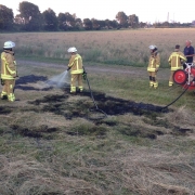 Am Mittwochabend wurde der Feuerwehr Duisburg gegen 21 Uhr eine unklare Rauchentwicklung Nahe der Mündelheimer Rheinbrücke gemeldet. Bereits auf der Anfahrt konnte südlich der Bundesstraße 288 ein Feuerschein auf dem Rheindeich bemerkt werden. Vor Ort wurde festgestellt, dass auf einer Fläche von rund 10 bis 15 Quadratmetern frisch gemähtes Heu brannte. Das Feuer wurde zunächst mit dem Schnellangriff des Hilfeleistungslöschgruppenfahrzeuges eingedämmt, anschließend wurden einzelne Glutnester ausgemacht. Da im näheren Umfeld weitere Glutnester nicht ausgeschlossen werden konnten, wurde die Wiese sicherheitshalber bewässert. Nach rund 20 Minuten konnten die 18 Einsatzkräfte des Löschzuges 750 wieder an ihren Standort einrücken.