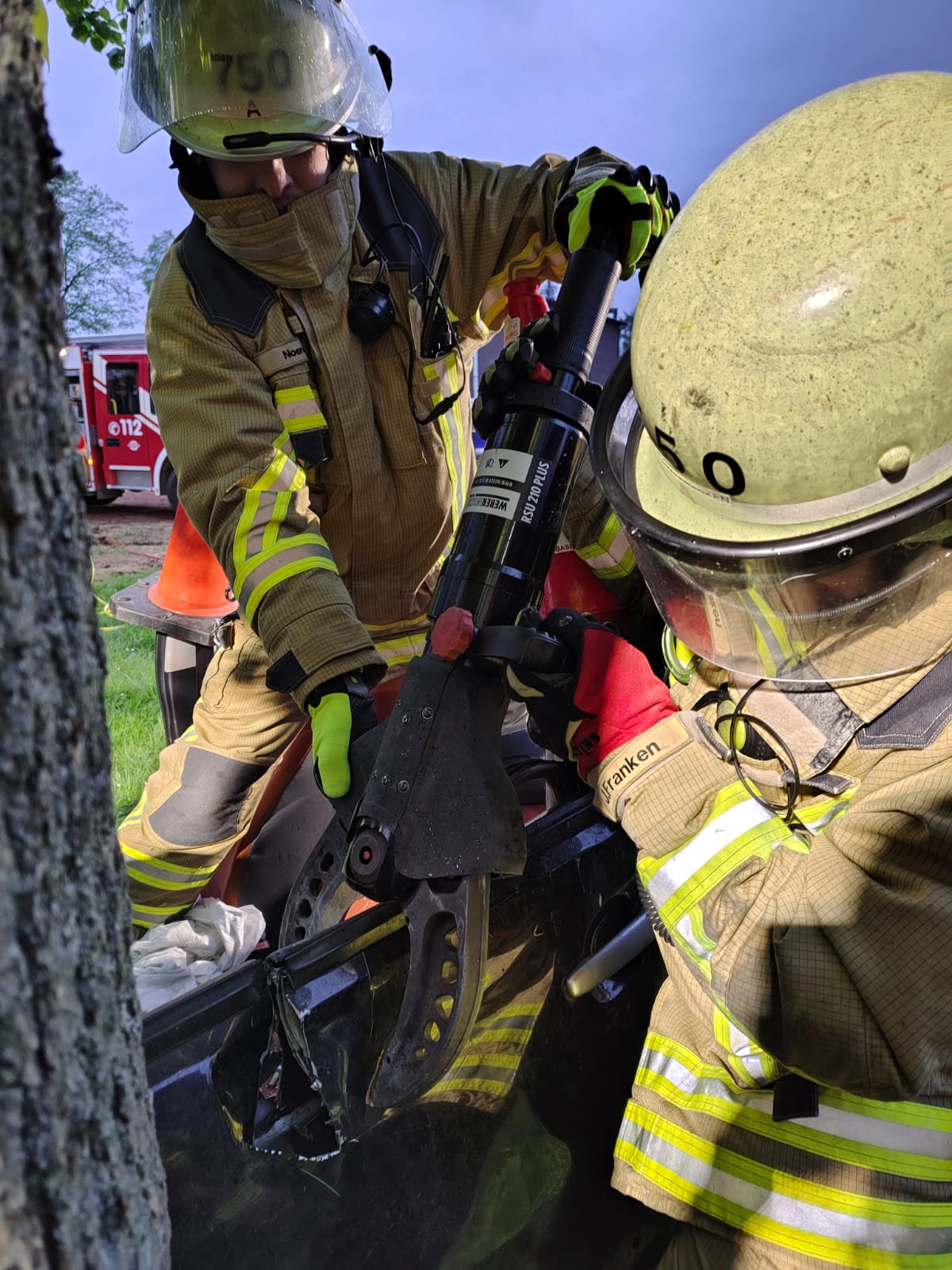 Am Osterwochenende war beim Löschzug 750 einiges los: neben dem Osterfeuer und dem gestrigen Einsatz, wurde an Gründonnerstag im Rahmen des wöchentlichen Dienstabends eine gemeinsame Übung mit dem THW OV Duisburg durchgeführt. Die angenommene Lage hierbei war ein Verkehrsunfall, bei dem ein PKW mit einem Baum kollidierte. Aufgabe der Feuerwehr war die patientenorientierte Rettung des Fahrers, bei der unter anderem der hydraulische Hilfeleistungssatz zum Einsatz kam. Die Kräfte des Technischen Hilfswerkes haben unterdessen die Einsatzstelle ausgeleuchtet und so optimale Lichtverhältnisse geschaffen.