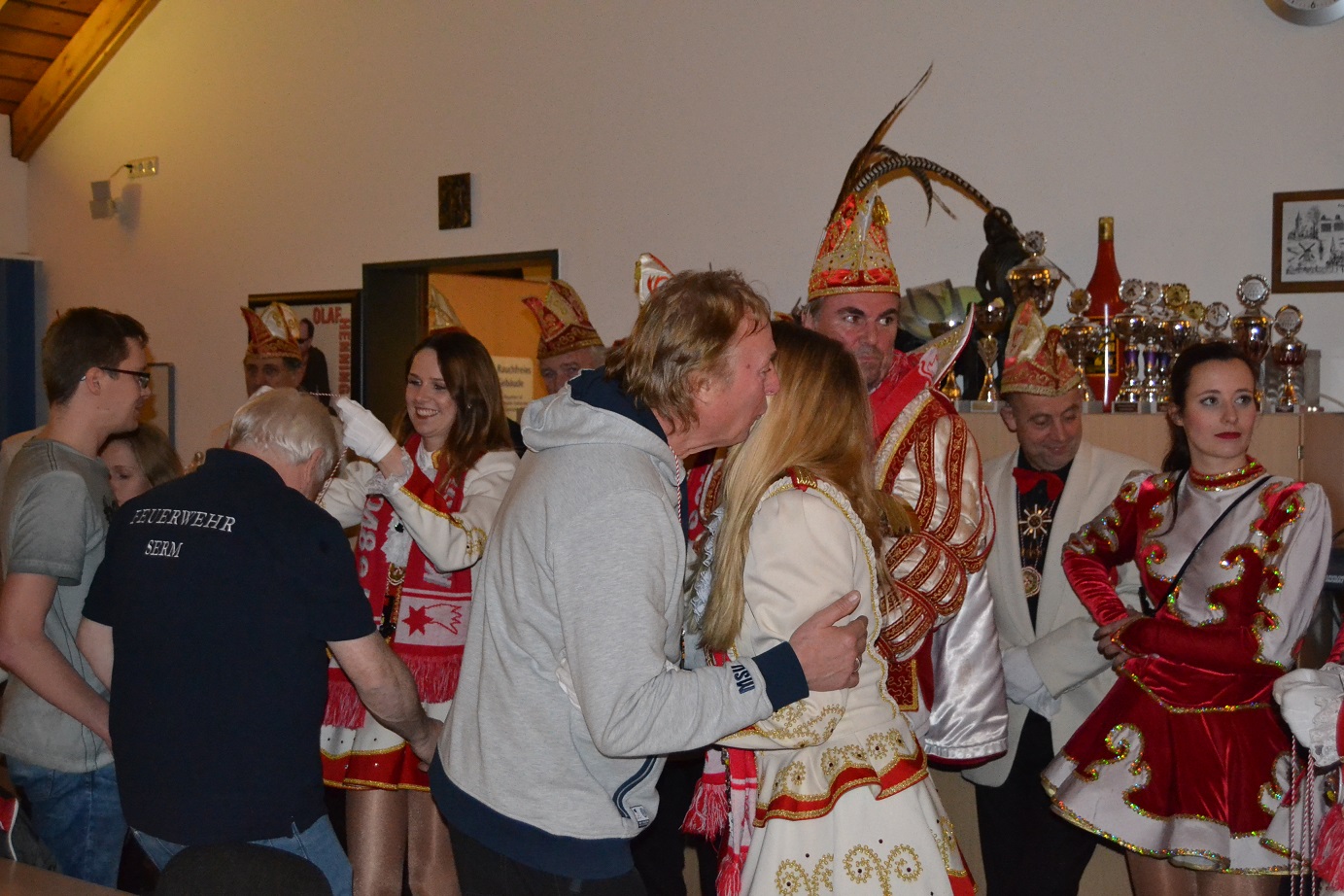 Wie in den vergangenen Jahren war jedoch die Vorstellung des neuen Sermer Karnevalsprinzens der Höhepunkt des Besuches. Doch diesmal war sie aus Sicht des Löschzuges 750 etwas Besonderes, denn ein für uns nicht unbekanntes Gesicht erlangte in dieser Session die Prinzenwürde: Seine Tollität Prinz Marcus I. ist zwar kein aktives Mitglied der Einheit, dennoch ist er im Hintergrund ein wichtiger Unterstützer des Löschzuges. So hat er als technischer Administrator entscheidend zum Design und Aufbau der löschzugeigenen Homepage beigetragen. Noch heute ist er mit Rat und Tat zur Stelle, wenn seine Hilfe benötigt wird. Selbst wenige Tage vor seiner Kührung hat Marcus noch an der Internetseite gearbeitet. Als Dankeschön für seine langjährige und insbesondere wertvolle Unterstützung überreichten die Mitglieder Marcus ein kleines Präsent. Vor allem aber wünscht der Löschzug 750 Marcus, seinem Hofmarschall Andre sowie seinen Paginnen Lara, Alina, Caro und Julia eine unvergessliche Session!