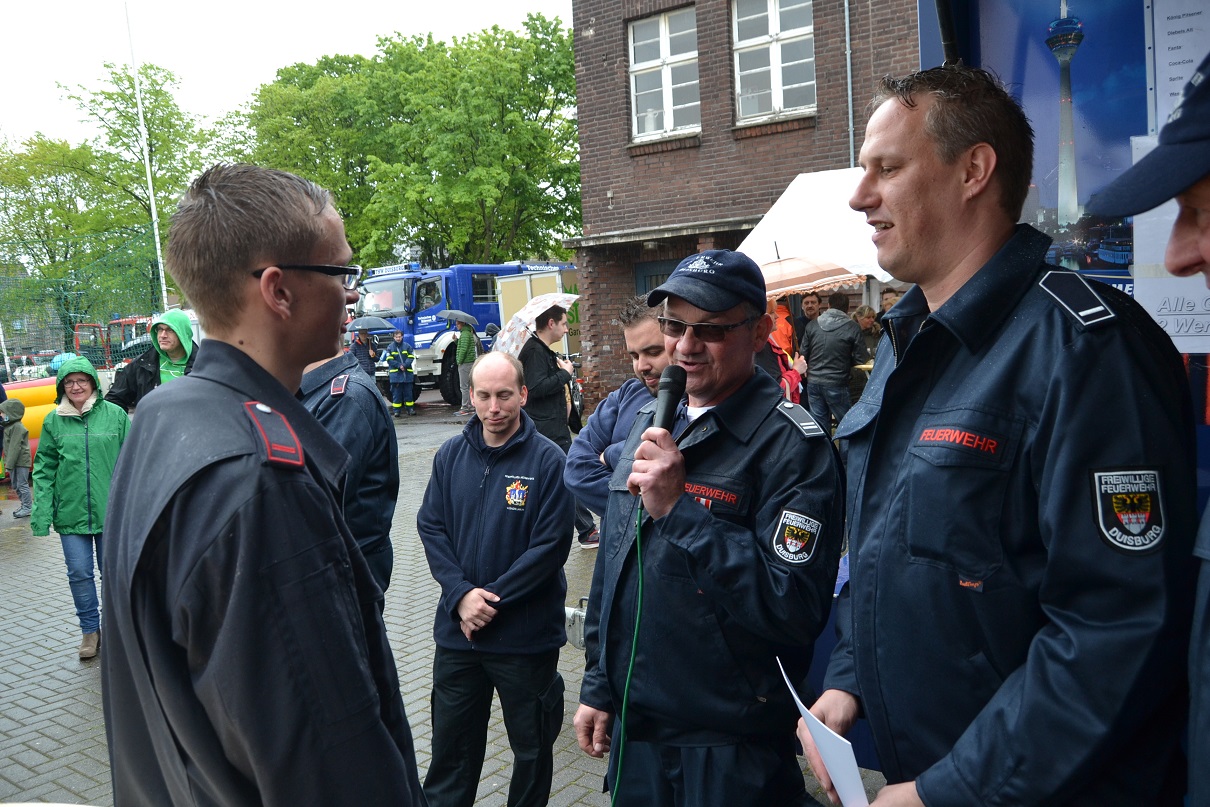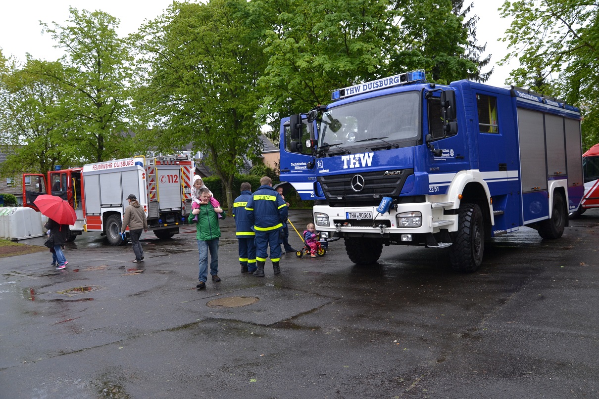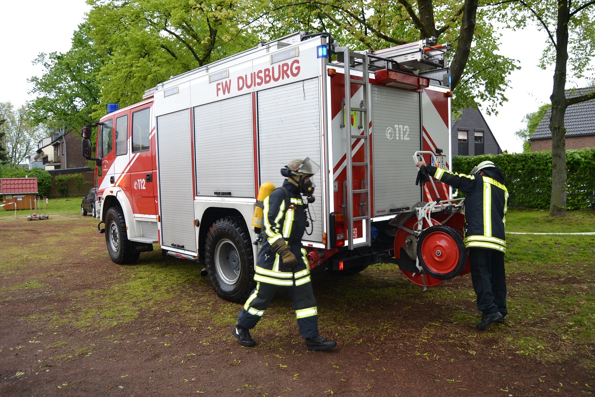 Der Löschzug durfte aber nicht nur zahlreiche Hobbysportler begrüßen, sondern auch überraschend viele Familien. Besonders die kleinen Gäste kamen auf ihre Kosten: So konnten zahlreiche Fahrzeuge bestaunt werden. Neben den Fahrzeugen des Löschzuges 750 standen auch der große Einsatzleitwagen der Berufsfeuerwehr und ein Gerätekraftwagen des THW Ortsverbandes Duisburg zur Schau. Zu den Highlights zählten für die meisten Kinder jedoch die Wasserspiele, bei denen sie zusammen mit Feuerwehrleuten unter anderem den simulierten Brand eines Holzhauses bekämpfen konnten. Ein weiterer Hingucker war zudem die Einsatzübung, bei der ein brennender Holzhaufen gelöscht wurde.