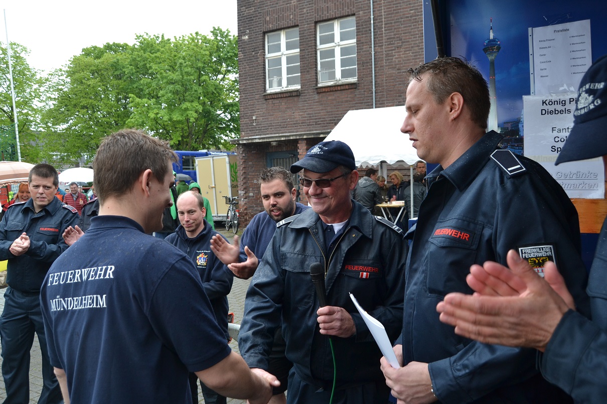 Dennoch ließen die befreundten Vereine, Feuerwehren und Hilfsorganisationen sowie die Bürgerinnen und Bürger den Löschzug nicht im Regen stehen. So sorgten die Gäste für den gesamten Tag über für eine zufriedenstellende Besucherresonanz. Das Zugpferd war dabei wieder einmal das Menschenkicker-Turnier. Bei englischen Wetterverhältnissen duellierten sich am Ende 15 Mannschaften auf dem Center-Court. Nach rund acht Stunden stand der Sieger fest: Im Endspiel schlugen die Jungschützen aus Mündelheim die Mannschaft des Löschzuges 750. Auch das kleine Finale konnte mit dem Offizierscorps ein Team der Schützenbruderschaft Mündelheim/Ehingen gewinnen. Platz 4 ging an das Bauunternehmen Riebe, Fünfter wurde die Löschgruppe 402 aus Vierlinden.