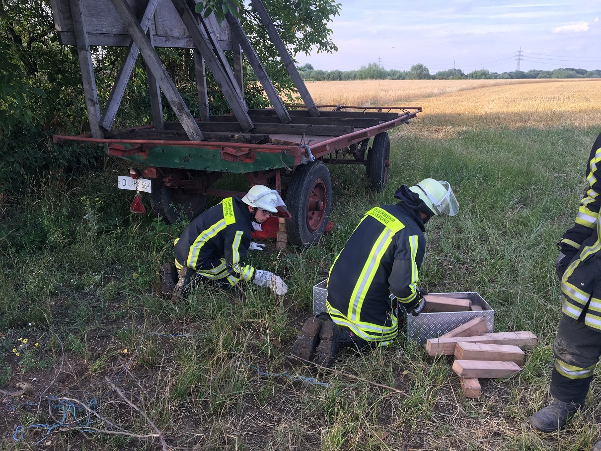 Bevor der Löschzug 750 am gestrigen Abend zu zwei Einsätzen (Person in Wasser und Bodenfeuer) ausrücken musste, fand die wöchentliche Übung statt. Angenommen wurde, dass ein Kind beim Spielen unter einem Anhänger eingeklemmt wurde. Zunächst wurde der Anhänger gegen ein Wegrutschen gesichert, indem er mit Unterlegkeilen fixert und mit Formhölzern unterbaut wurde. Anschließend wurde der Anhänger mit Hebekissen vorsichtig angehoben, damit das Kind – welches wie immer hervorragend vom löschzugeigenen Dummy Paul immitiert wurde – gerettet werden konnte.