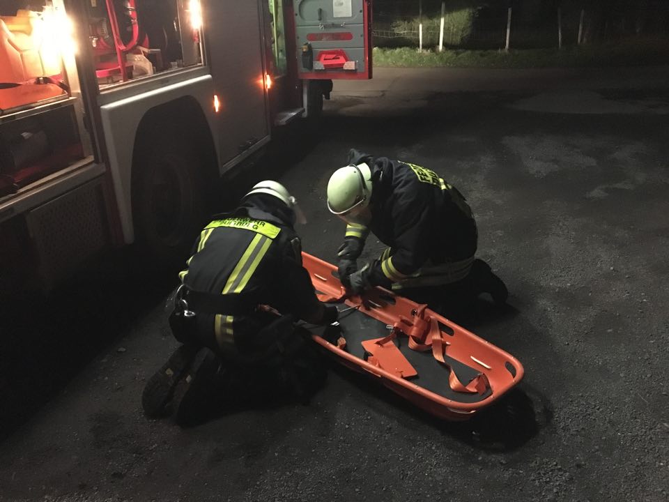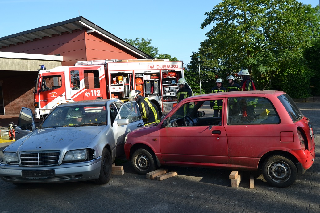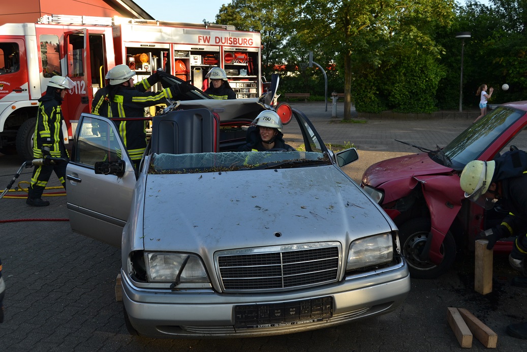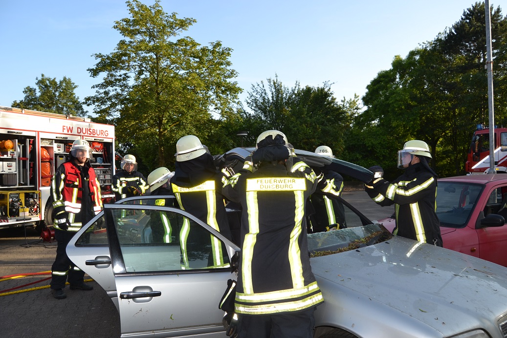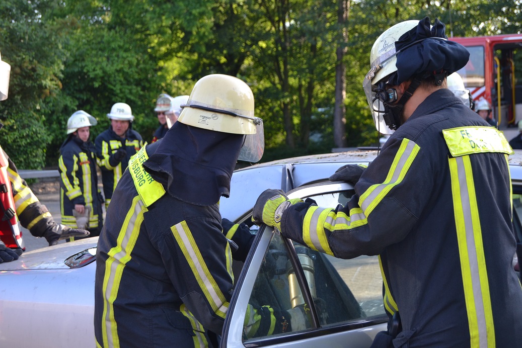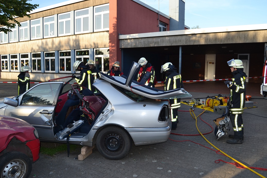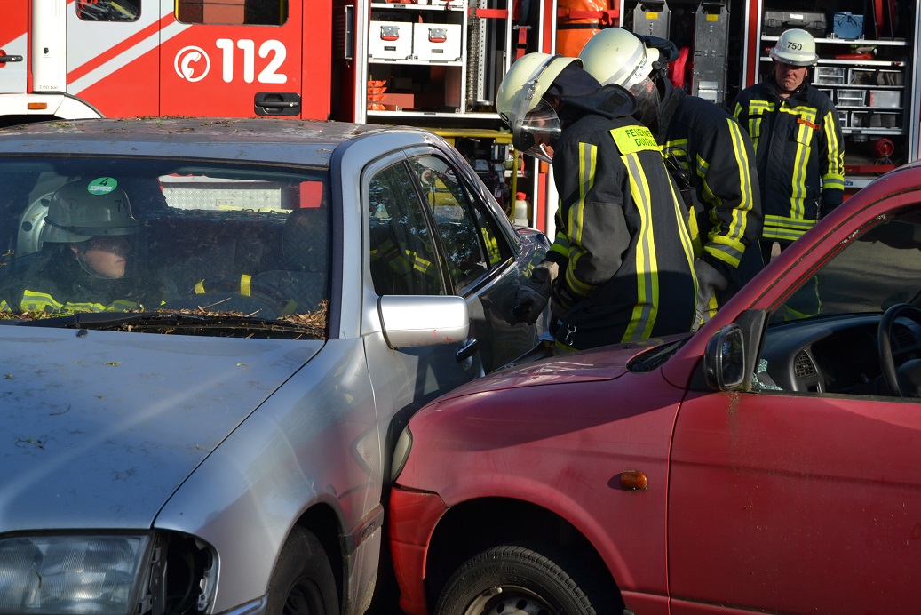 Am vergangenen Donnerstag stand die Personenrettung nach einem Verkehrsunfall auf dem Dienstplan des Löschzuges 750. Hierbei wurde ein seitlicher Zusammenstoß zweier PKW simuliert, bei dem eine fiktive Person in ihrem Fahrzeug eingeklemmt wurde. Trainiert wurde vor allem der Umgang mit dem hydraulischen Rettungssatz, der eine Rettungsschere und einen Rettungsspreizer sowie Hydrozylinder umfasst. Bevor die technische Rettung eingeleitet werden konnte, mussten zunächst Sicherungsmaßnahmen durchgeführt werden. So wurden die Fahrzeuge mit Holzkeilen unterbaut, um ein Wegrollen zu verhindern. Außerdem wurden die Fahrzeugbatterien abgeklemmt sowie ein Airbag-Sicherungssystem als Schutz vor unkontrolliert auslösenden Airbags über dem Lenkrad installiert. Anschließend wurden die Seitentüren des Mercedes mithilfe des Rettungsspreizers entfernt, ehe das Autodach mit der Rettungsschere abgetrennt wurde. Abschließend wurde der vordere Teil des verunfallten PKW mit einem Zylinder auseinander gedrückt.