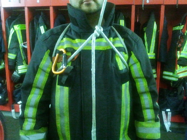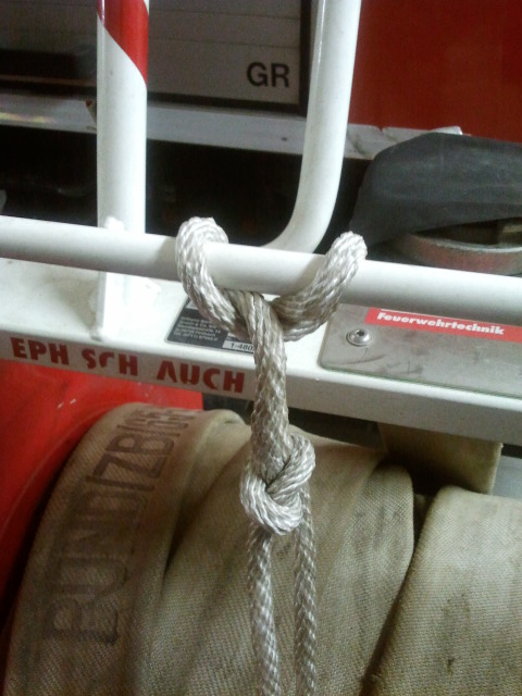 Der heutige Übungsdienst bestand aus einem praktischen und einem theoretischen Teil. Im Theorieunterricht wurde anhand von zwei exemplarischen Einsatzszenarien (Verkehrsunfall mit eingeklemmter Person und Wohnungsbrand mit vermisster Person) die Aufgabenverteilung der Mannschaft wiederholt. Im anschließenden praktischen Teil wurden Knoten und Stiche geübt, darunter der Mastwurf (Bild 1) und der Rettungsknoten (Bild 2).