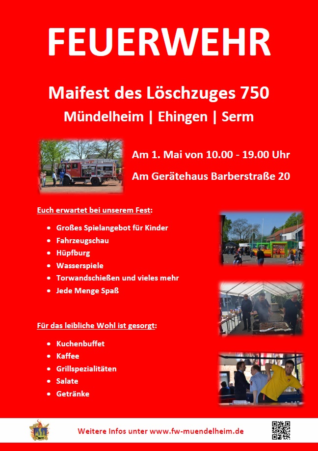Am 1. Mai lädt die Freiwillige Feuerwehr Mündelheim/Serm/Ehingen in der Zeit von 10 bis 19 Uhr zu ihrem traditionellen Maifest rund um das Gerätehaus an der Barberstraße 20 ein.