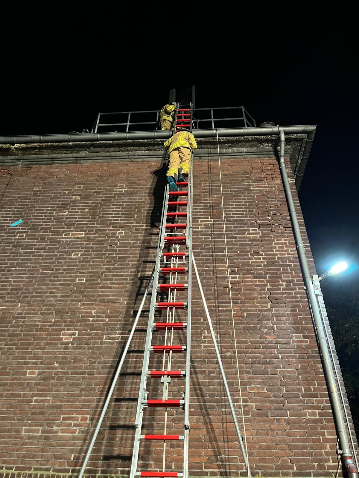 Die nächste Übungslage wurde dann mit dem Löschzug 710 (Buchholz / Bissingheim) gefahren. Hierbei war es zu einem Brand im ersten Obergeschoss einer Doppelhaushälfte gekommen. An einem Fenster sowie auf dem rückseitigen Balkon machten sich zwei Personen bemerkbar, zwei weitere galten als vermisst. Umgehend gingen mehrere Trupps zur Menschenrettung und zur Brandbekämpfung in das Gebäude vor. Die beiden im Gebäude vermissten Personen wurden über das Treppenhaus, die anderen beiden über Steckleitern gerettet.