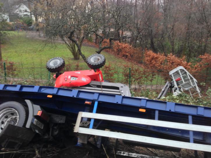 Ein mit einer Hebebühne beladener Sattelzug kam auf der Bundesstraße 288 in Fahrtrichtung Krefeld kurz hinter der Anschlussstelle Duisburg-Huckingen von der Fahrbahn ab und kippte den Seitenstreifen hinab. Der Fahrer, der bei dem Unfall leicht verletzt wurde, war nicht eingeklemmt und konnte sich selbstständig aus dem Führerhaus befreien. Allerdings liefen Betriebsmittel aus, die von der Feuerwehr gebunden werden mussten.