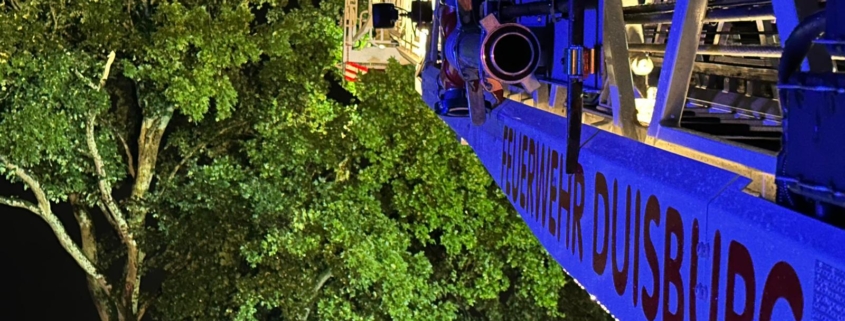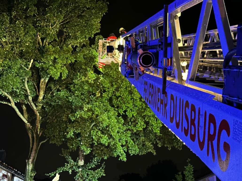 Anschließend wurden zwei Einsatzstellen in Ungelsheim abgearbeitet. Erst wurde ein loser Ast in einem Baum gemeldet. Allerdings war hier größtenteils die Baumkrone herausgebrochen. Diese wurde über die Drehleiter entfernt und im Anschluss mit einer Kettensäge zerlegt. Anschließend mussten aus einem weiteren Baum lose Äste geschnitten werden, damit weitere Kräfte der Feuerwehr Duisburg sicher an ihrer Einsatzstelle arbeiten konnten.