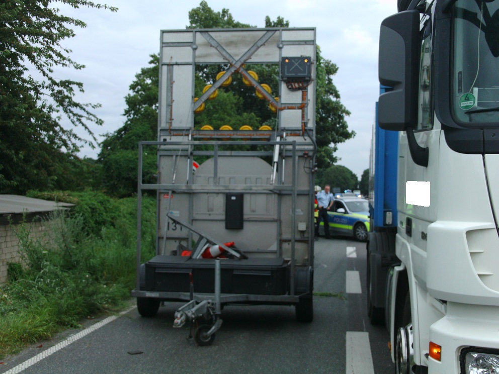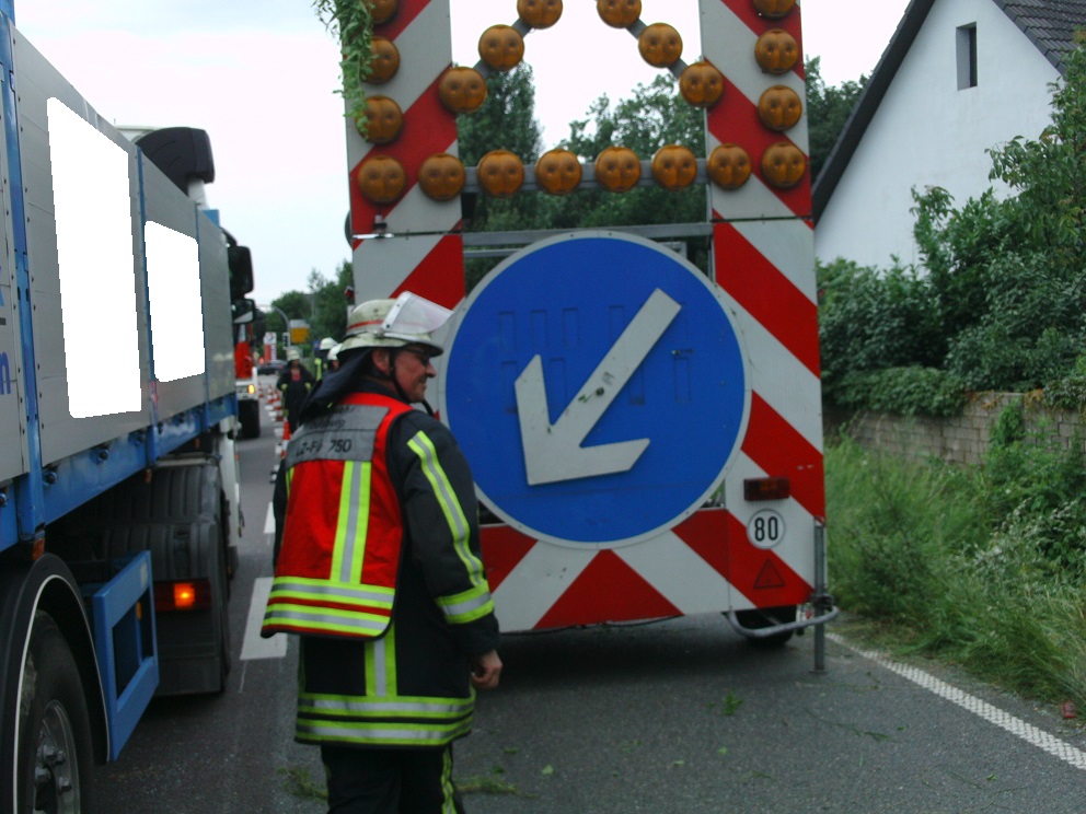 Auf der Bundesstraße 288 stießen am Freitagnachmittag in Höhe der Siedlung Bonnefeld ein PKW und ein LKW im Baustellenbereich zusammen. Infolge des Zusammenpralls stürzte darüber hinaus ein auf der Fahrbahn abgestellter Verkehrssicherungsanhänger in den Straßengraben. Zur Bergung des Anhängers wurde der Löschzug Mündelheim auf Nachforderung der Polizei alarmiert. Personen kamen bei dem Verkehrsunfall glücklicherweise nicht zu Schaden.