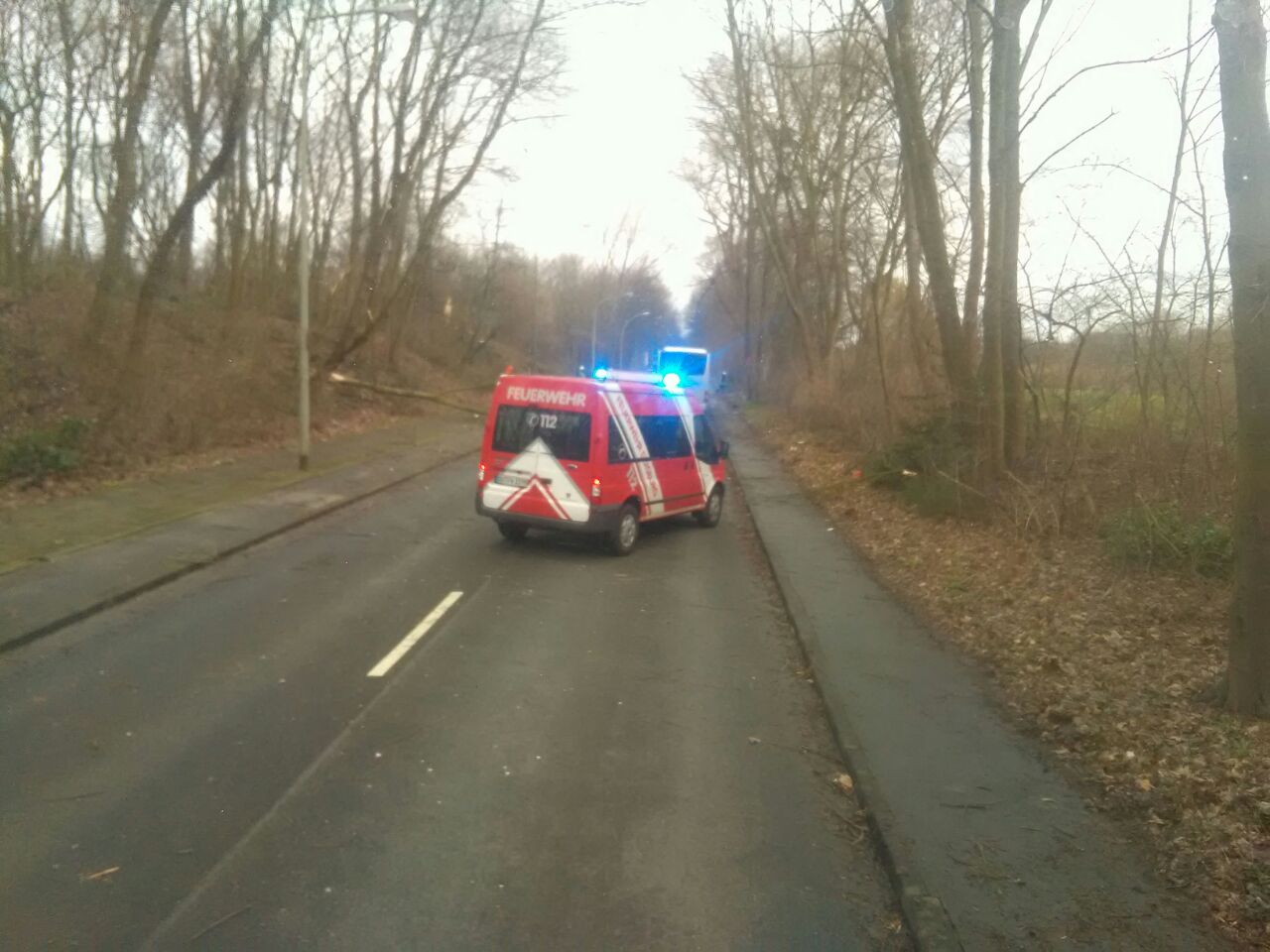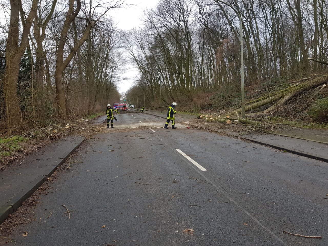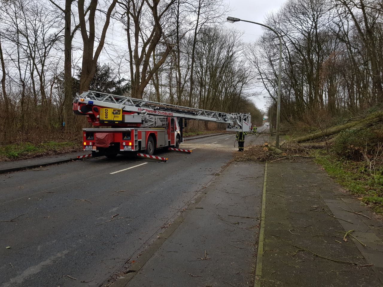 Das Löschgruppen- und das Mannschaftstransportfahrzeug wurden gegen 11:00 Uhr zu ihrem ersten Einsatz gerufen, gemeldet wurde ein abgedecktes Dach an der Kreuzung Krefelder Straße / Am Seltenreich. Durch die heftigen Böen war eine in Leichtbauweise errichtete Lagerhalle teilweise eingestürzt, verletzt wurde glücklicherweise niemand. Im Anschluss daran rückten die Kräfte zu einem größeren Einsatz zum Neuen Angerbach nach Ungelsheim aus, wo gleich drei Bäume auf die Fahrbahn gestürzt waren. Glück hatte dabei die Besatzung eines Reisebusses, die von zwei Bäumen eingeschlossen wurde. Die Einsatzkräfte zerlegten die Bäume mit einer Kettensäge und räumten diese beiseite. Darüber hinaus wurden über eine Drehleiter lose Äste aus einer Baumkrone sowie zwei Bäume, die zu fallen drohten, entfernt. Bis zum Abend wurden das Löschgruppen- und das Mannschaftstransportfahrzeug zu 14 weiteren Einsatzstellen in den Stadtteilen Buchholz, Huckingen, Wanheim und Wanheimerort disponiert. Häufige Einsatzstichworte waren dabei „Baum auf Straße“ oder „Baum auf Haus“. Außerdem drohten in einem Fall lose Dachziegel auf einen Gehweg zu fallen.
