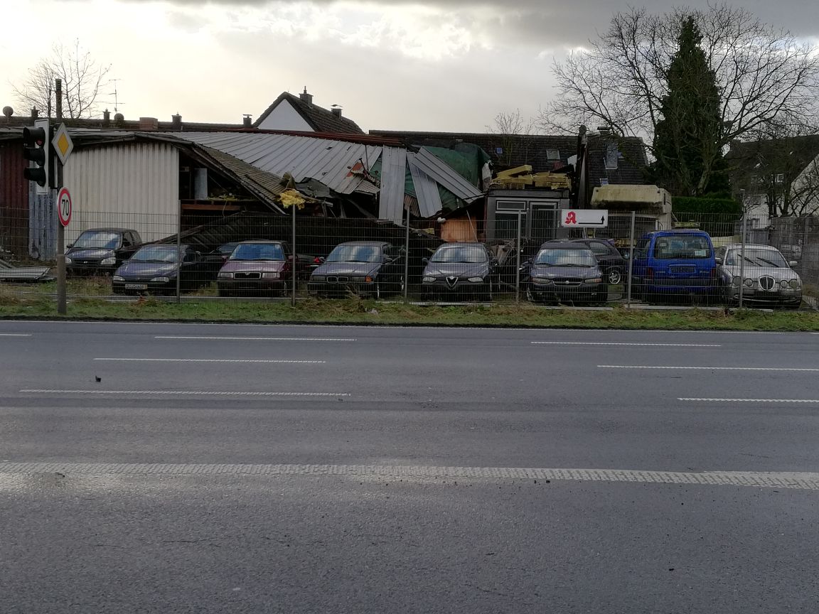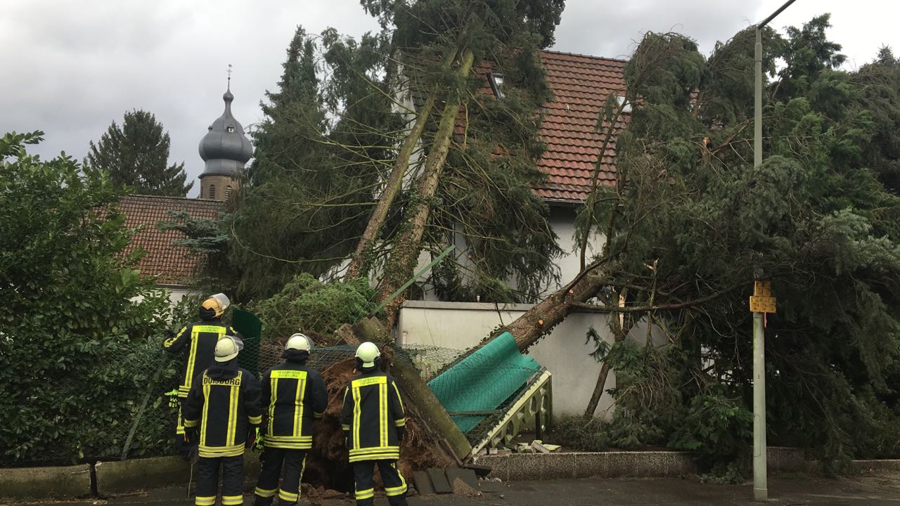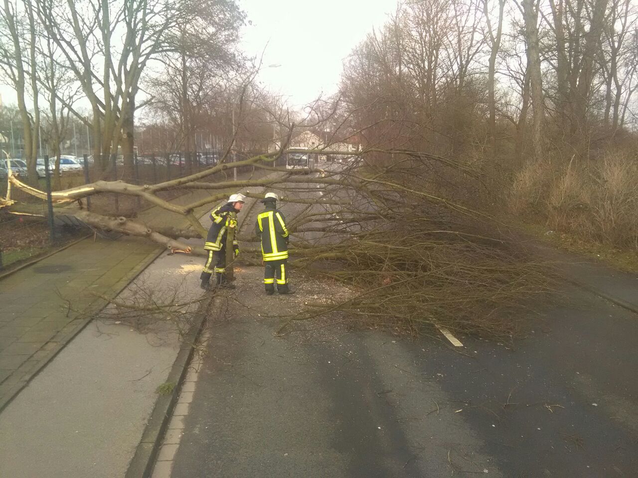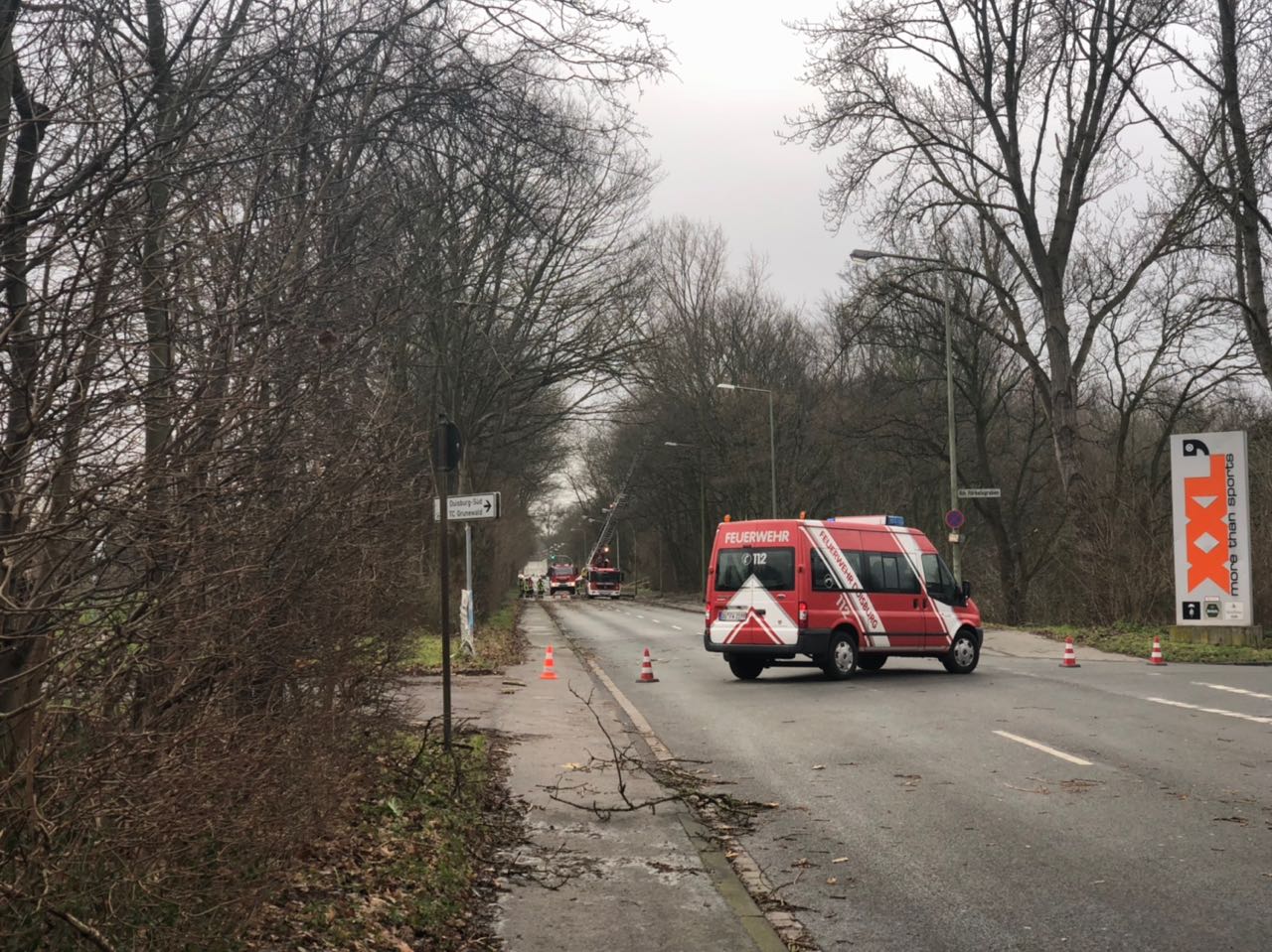 Das Löschgruppen- und das Mannschaftstransportfahrzeug wurden gegen 11:00 Uhr zu ihrem ersten Einsatz gerufen, gemeldet wurde ein abgedecktes Dach an der Kreuzung Krefelder Straße / Am Seltenreich. Durch die heftigen Böen war eine in Leichtbauweise errichtete Lagerhalle teilweise eingestürzt, verletzt wurde glücklicherweise niemand. Im Anschluss daran rückten die Kräfte zu einem größeren Einsatz zum Neuen Angerbach nach Ungelsheim aus, wo gleich drei Bäume auf die Fahrbahn gestürzt waren. Glück hatte dabei die Besatzung eines Reisebusses, die von zwei Bäumen eingeschlossen wurde. Die Einsatzkräfte zerlegten die Bäume mit einer Kettensäge und räumten diese beiseite. Darüber hinaus wurden über eine Drehleiter lose Äste aus einer Baumkrone sowie zwei Bäume, die zu fallen drohten, entfernt. Bis zum Abend wurden das Löschgruppen- und das Mannschaftstransportfahrzeug zu 14 weiteren Einsatzstellen in den Stadtteilen Buchholz, Huckingen, Wanheim und Wanheimerort disponiert. Häufige Einsatzstichworte waren dabei „Baum auf Straße“ oder „Baum auf Haus“. Außerdem drohten in einem Fall lose Dachziegel auf einen Gehweg zu fallen.