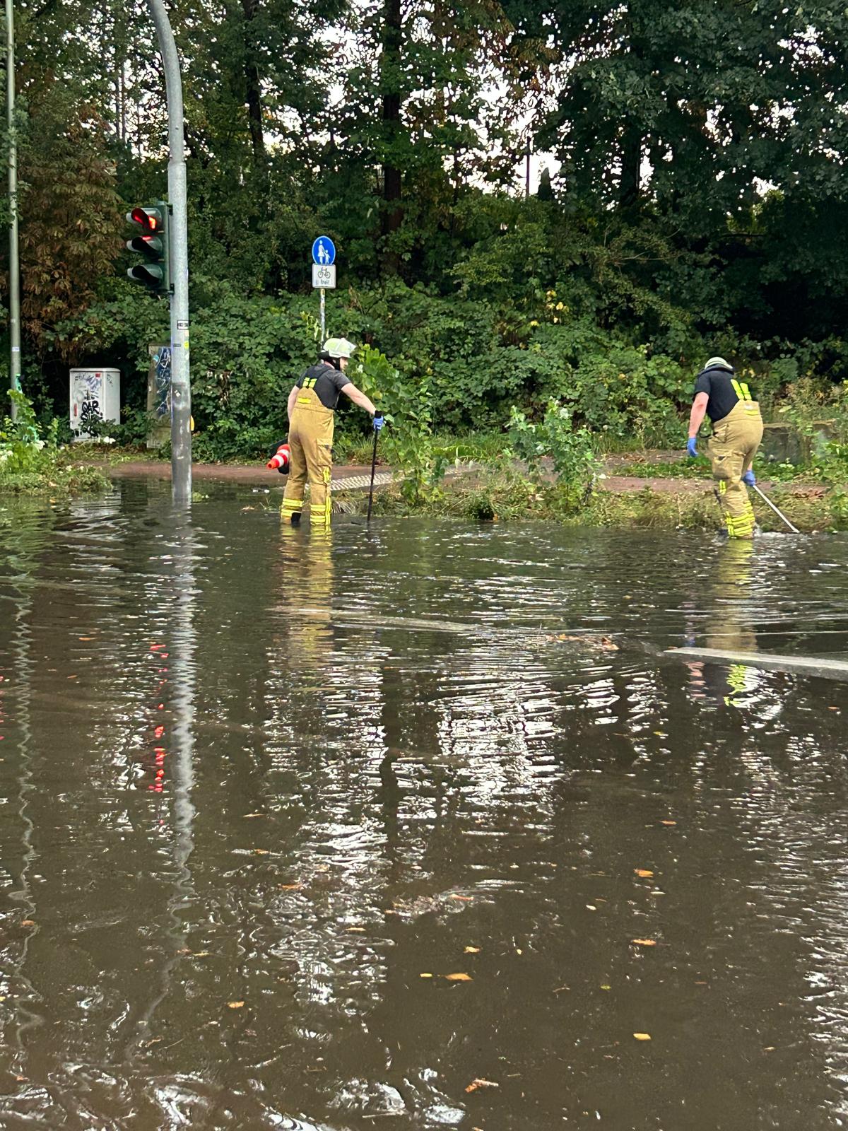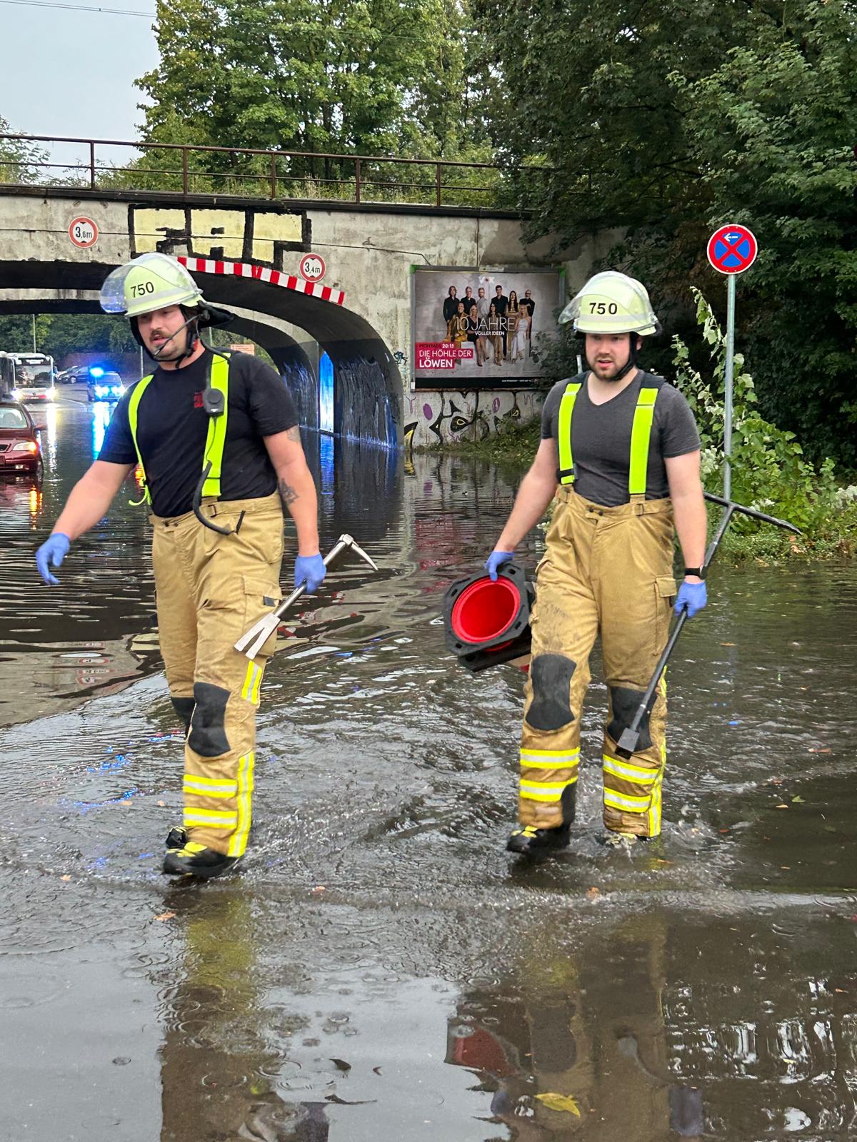Gemeldet waren hier mehrere Fahrzeuge, die in einer überfluteten Unterführung in Neudorf feststeckten. Nach der ersten Meldung sollten sich noch Personen in den Fahrzeugen befinden, glücklicherweise konnten diese sich selbstständig befreien. Durch die Kräfte der Feuerwehr wurden die Abflüsse am Straßenrand sowie Gullydeckel geöffnet, sodass das Wasser abfließen konnte. Anschließend wurden die Fahrzeuge beiseite geschoben, um die Straße wieder passierbar zu machen.